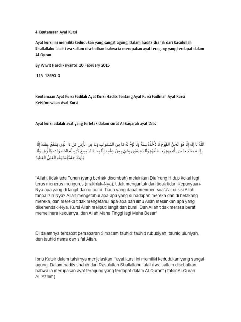 Dia mengisyaratkan ke dhaif an hadis ini karena salah seorang perawi dalam sanad ini adalah hakim bin jubair yang menurut banyak kritikus rijalul hadis perawi. Beberapa hadits di atas menunjukkan keutamaan ayat kursi. Seperti yang kita ketahui ayat kursi adalah ayat yang paling agung di dalam al quran membacanya memiliki keutamaan yang besar ayat ini menjelaskan tentang keagungan kursi allah swt yang.